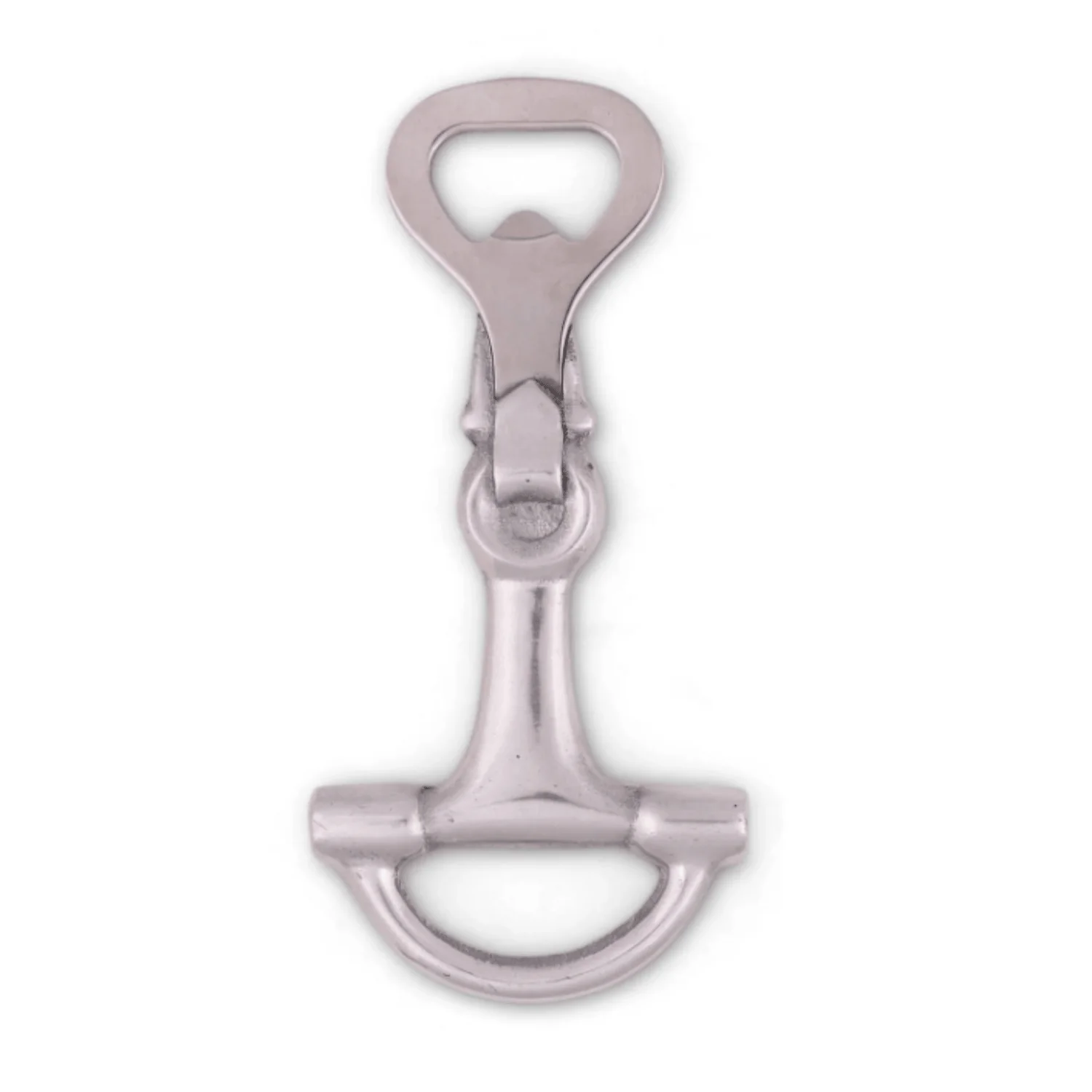 Saddle up and enliven your bar decor with the two-bit bottle opener from the Equestrian Collection by Arthur Court. Sand-cast aluminum is rendered in the shape of a classic Western bridle bit, a perfect addition to the horse-lover's rustic kitchen decor. The opener tip is made from stainless steel, firmly welded into place on the bit handle making the opener extremely durable, ideal for opening even the toughest caps. This bottle opener is crafted from a designer aluminum alloy, fully compliant with FDA regulations for food-safe materials, as is the stainless lever. To clean your bottle opener, wash with gentle soap and warm water, then dry immediately. Although the bottle opener is made of tarnish-resistant metal, you may choose to polish it for an enhanced shine. This tool is delivered in a gift box, ideal for a hostess gift or wedding registry.