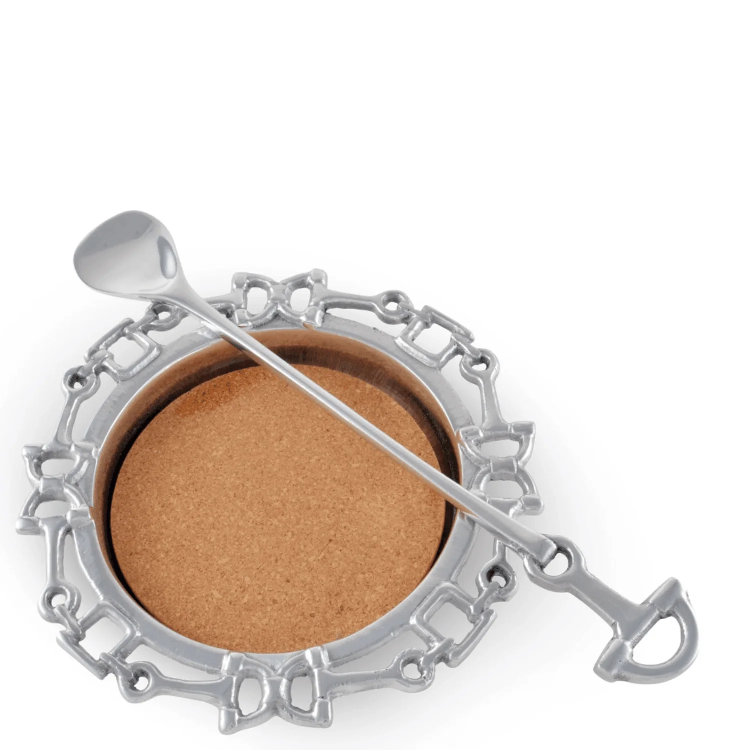 Interlocking bits encircle the pitcher's handmade, aluminum base, which also comes with a removable cork. Another half-piece bit attaches to the ladle's long handle, forming a sturdy grip above the glass for stirring. Create favorite drink mixes for parties or evening cocktails in this Arthur Court equestrian pitcher set. Horse lovers will admire the decorative base adorned with interlocking horse bits that comfortably and safely hold the glass pitcher in place when mixing. The included ladle features a half-piece horse bit at the end that provides a sturdy grip so it won’t slip from fingers when stirring. The ladle is long enough to reach the bottom of the pitcher so ingredients are fully mixed.