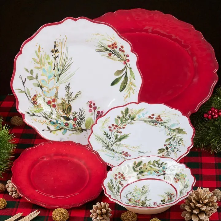 The platter features an intricate holiday wreath design, adorned with vibrant holly berries, pine sprigs, and delicate florals, all framed by a cheerful red scalloped edge. Its seasonal motif brings warmth and charm to your tablescape while making your dishes the centerpiece of every gathering. Ideal for both casual family dinners and festive parties, this platter allows you to serve in style and create a coordinated holiday look with other pieces from the Christmas Gatherings collection.