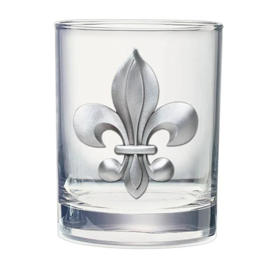Kentucky Pewter Double Old-Fashioned Glass – By a Nose, Fleur-de-Lis, or Racehorse in Pasture