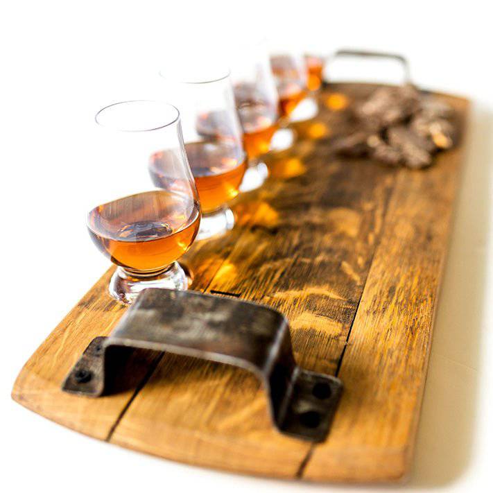 Be the best party host or the gift giver of the year with this Whiskey Tasting Flight Tray! It includes five official Glencairn glasses so you can taste an array of drinks at once, plus plenty of space for your favorite snacks to accompany your drinks! This Flight Tray is certainly a unique piece that'll be sure to bring a rustic charm to your home. Made from upcycled bourbon barrel heads, and finished with food-safe raw linseed oil.