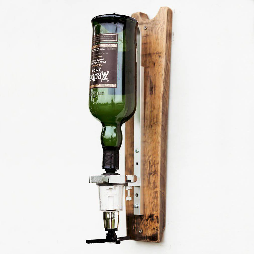 Style and functionality meet in this Whiskey Wall Dispenser. Mounted on a half of an upcycled bourbon stave and featuring one spout. Whether you're looking for an addition to your kitchen, dining room, or entertainment space, this dispenser's rustic charm will bring both warmth and functionality into your home.
